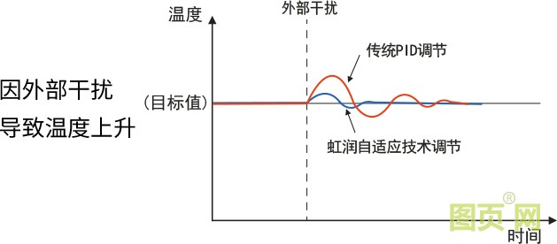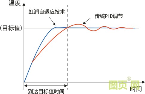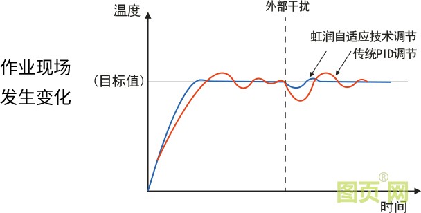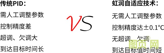 虹潤自適應(yīng)控制技術(shù)可自動整定出較佳PID值。監(jiān)視裝備的溫度控制狀態(tài),自動調(diào)節(jié)PID值,對工件變化及裝備變化、環(huán)境變化等進行較佳溫度控制。