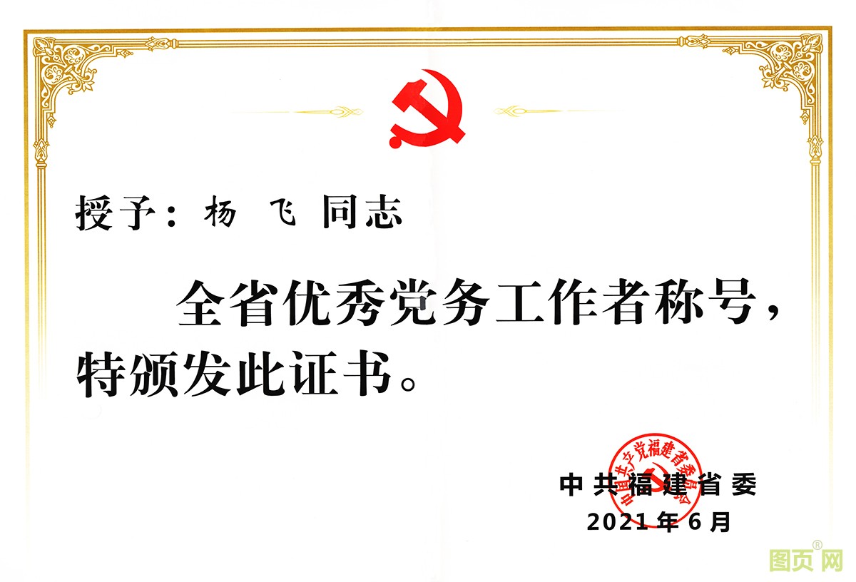 2021年6月中共福建省委授予支部 “福建省民營(yíng)企業(yè)黨建工作先進(jìn)單位”榮譽(yù)稱號(hào)(全省共50家民營(yíng)企業(yè)黨組織,其中南平市共4家民營(yíng)企業(yè)黨組織獲此榮譽(yù))、授予支部書記楊飛“全省優(yōu)秀黨務(wù)工作者”稱號(hào)。