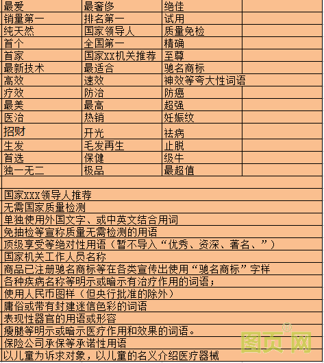 1、國家級(jí)、世界級(jí)、最高級(jí)、最佳、第一、唯一、首個(gè)、最好、精確、頂級(jí)、最低、最底、最、最便宜、最大程度、