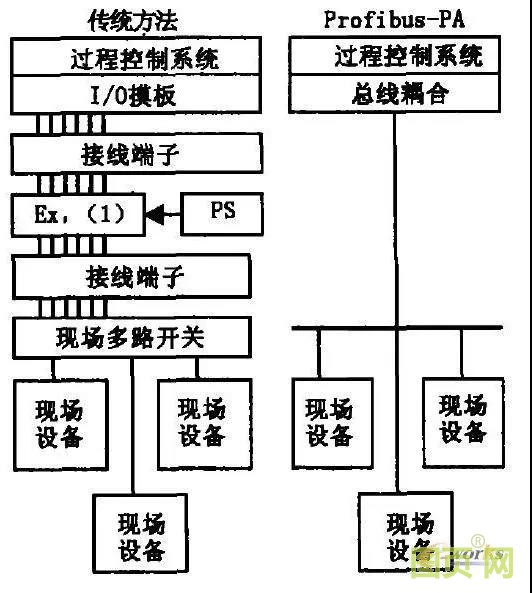 Profibus-PA是為過(guò)程自動(dòng)化特別設(shè)計(jì)的,它將自動(dòng)化系統(tǒng)和過(guò)程控制系統(tǒng)與壓力、溫度和液位變送器等現(xiàn)場(chǎng)設(shè)備連接起來(lái)。它可用來(lái)替代4~20mA的模擬技術(shù)。使用傳統(tǒng)方法與使用Prof-ibus-PA的比較如圖2所示。從現(xiàn)場(chǎng)到現(xiàn)場(chǎng)多路開(kāi)關(guān)基本一致。使用傳統(tǒng)布線方法,每一個(gè)信號(hào)都需獨(dú)立引線至過(guò)程控制系統(tǒng)的I/O模板;每個(gè)設(shè)備都需單獨(dú)電源。相反,使用Profibus-PA,只需一對(duì)電纜就可以傳輸所有信息并向現(xiàn)場(chǎng)設(shè)備供電;不僅節(jié)省電纜費(fèi)用,同時(shí)減少了系統(tǒng)I/O模板數(shù)量。
