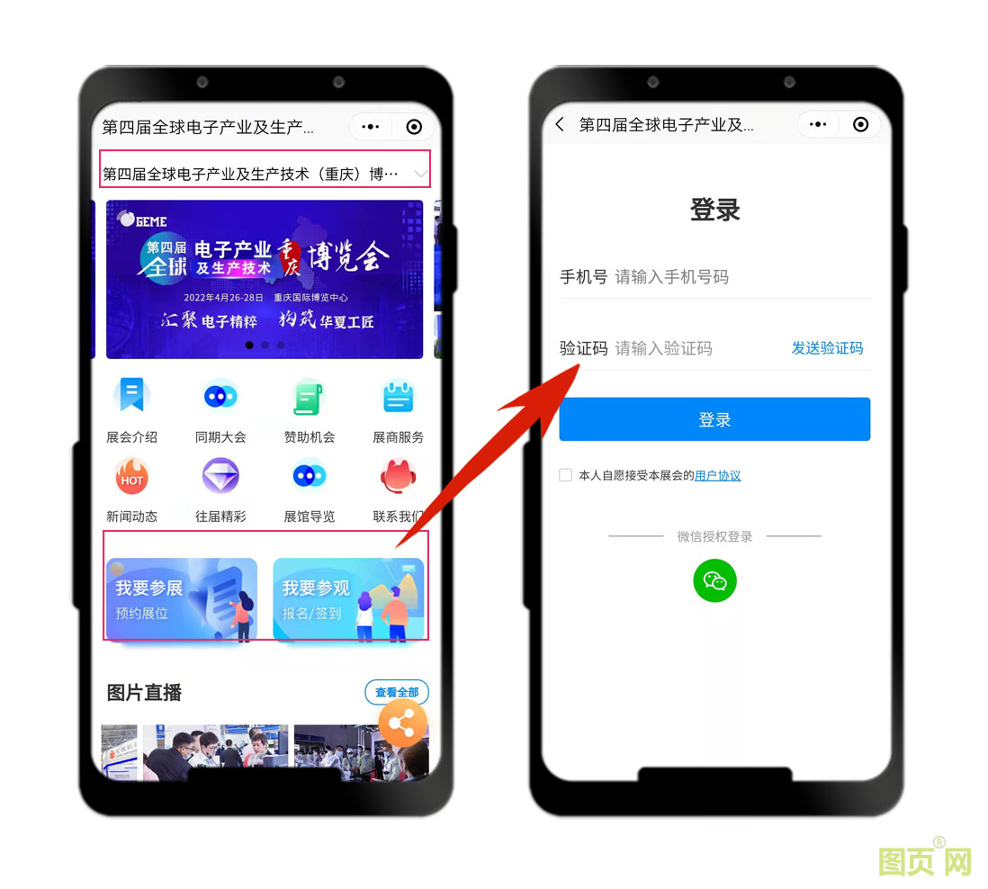 進(jìn)入GEME 2022官方小程序首頁(yè),點(diǎn)擊頁(yè)面中間“我要參展” “ 我要參觀 ”按鈕,注冊(cè)綁定個(gè)人賬號(hào),即可快速進(jìn)行報(bào)名登記。