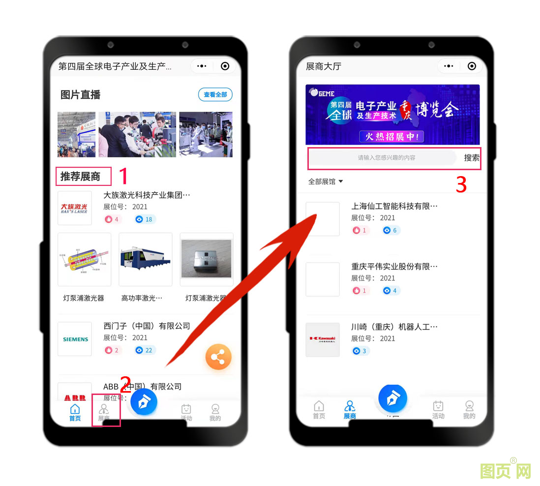 3)點(diǎn)擊小程序首頁(yè)下方按鈕“展商”,點(diǎn)擊頁(yè)面頂部導(dǎo)航搜索條,即可查詢你感興趣的展商企業(yè)。