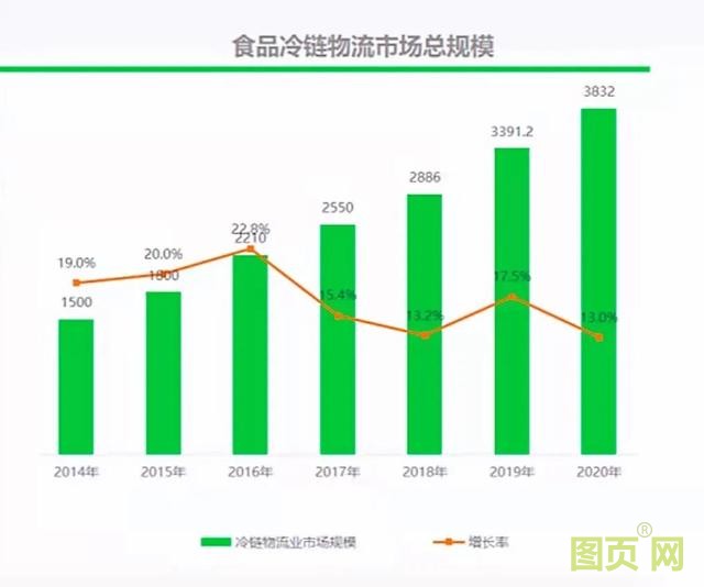 2019年,我國冷鏈物流市場規(guī)模為3391.2億元,比上年增長505.2億元,同比增幅17.5%。2020年我國冷鏈物流市場總規(guī)模為3832億元,比2019年增長440.8億元,同比增長13%,并且仍保持增長態(tài)勢。