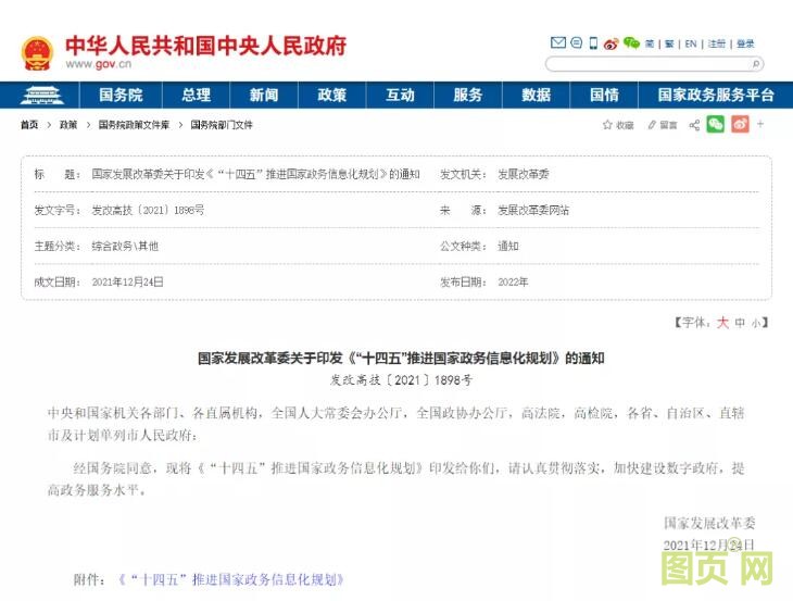 為統(tǒng)籌推進“十四五”期間國家政務信息化工作,指導各地方有序開展政務信息化建設,國家發(fā)改委制定并印發(fā)了《十四五”推進國家政務信息化規(guī)劃》。