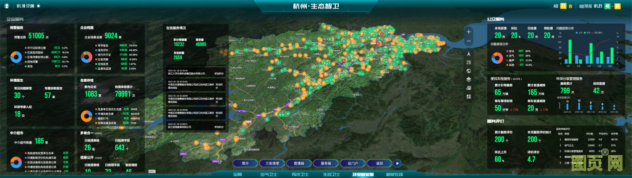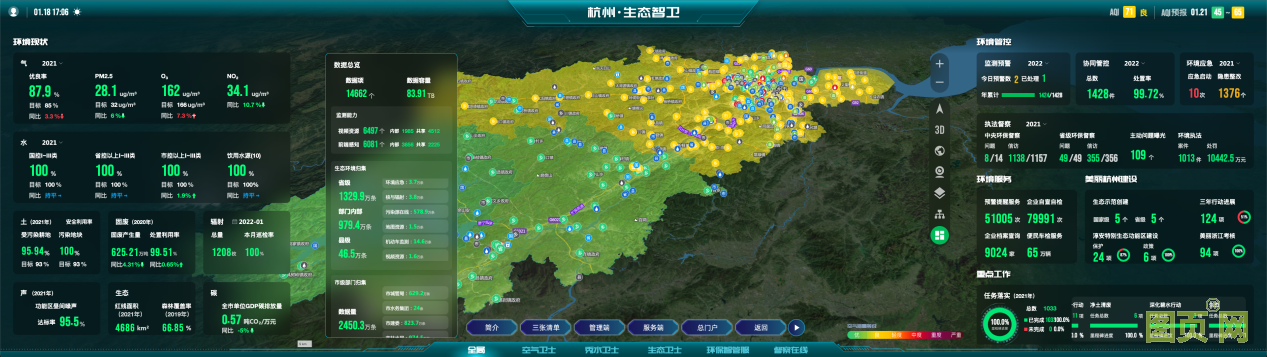 “杭州·生態(tài)智衛(wèi)”是杭州市數(shù)字化改革的重大多跨場景之一,是杭州市生態(tài)環(huán)境局響應浙江省數(shù)字化改革要求,圍繞“重大需求、多跨場景、改革任務”三張清單,系統(tǒng)化推進大生態(tài)協(xié)同保護的重要舉措。場景按照“一張圖”理念,匯聚生態(tài)環(huán)境系統(tǒng)內外數(shù)據(jù)83.9TB,以“保護”“服務”“督察”為切口,建成“空氣衛(wèi)士”“秀水衛(wèi)士”“生態(tài)衛(wèi)士”“環(huán)保智管服”“督察在線”等應用場景。上線以來,累計已處置預警問題9000余個,輸出服務4.7萬余次,提醒幫助企業(yè)及時糾錯,避免進一步造成行政處罰2000余萬元,智能引導查處環(huán)境犯罪案件7起。
