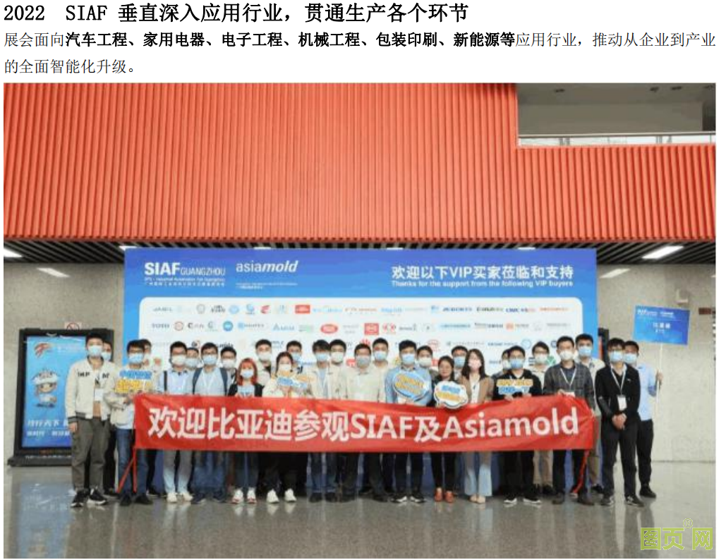 2022 SIAF 廣州自動(dòng)化展 廣州國(guó)際工業(yè)自動(dòng)化技術(shù)及裝備展覽會(huì)(SIAF)匯聚來(lái)自海內(nèi)外的知名展商呈獻(xiàn)前沿智能工業(yè)自動(dòng)化技術(shù) 和解決方案,深入剖析全球市場(chǎng)的熱門(mén)趨勢(shì),并迎來(lái)眾多專(zhuān)業(yè)觀眾蒞臨參觀。 SIAF 廣州自動(dòng)化展將與 Asiamold 廣州模具展同期舉辦,兩展展覽總面積達(dá) 40,000 平方米,數(shù)百家展 商聯(lián)合傾力展示,預(yù)計(jì)迎來(lái)逾 65,000 名專(zhuān)業(yè)觀眾。