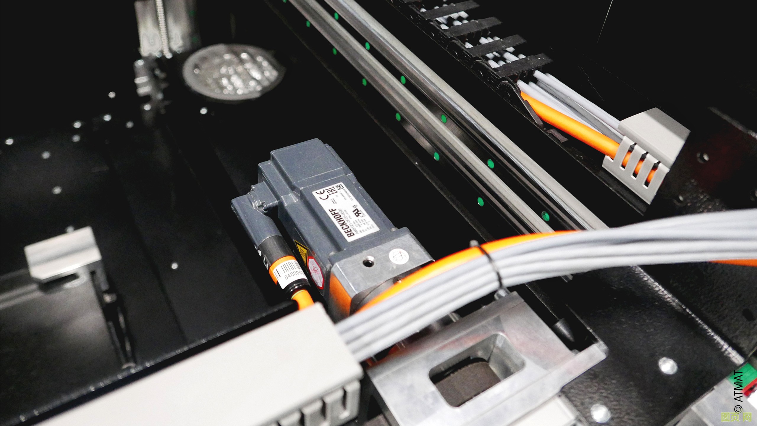 ATMAT 為大幅面打印機配備了倍福的 AM8121緊湊型伺服電機。它們與巨大的結(jié)構(gòu)體一起,確保 50 μm(X/Y 軸)和 10 μm(Z 軸)的定位精度。對于 ATMAT 來說,以前使用 Jupiter 系列積累的積極經(jīng)驗對選擇驅(qū)動產(chǎn)品起了決定性作用?!癆M8121緊湊型伺服電機的其中一個優(yōu)勢是,它們可以通過 EL72xx 伺服電機端子模塊驅(qū)動?!北陡^(qū)域銷售經(jīng)理 Krzysztof Pulut 說道。“由于標(biāo)準(zhǔn) EtherCAT 端子模塊的體積非常小,與傳統(tǒng)的伺服驅(qū)動器相比,它們可以節(jié)省控制柜中的大量空間。此外,單電纜技術(shù)(OCT)將動力和反饋系統(tǒng)整合在一根電纜上,大大減少了打印機的布線工作。OCT 不僅能夠減少布線出錯的風(fēng)險,而且還能夠減少設(shè)備制造商需要保留的系統(tǒng)組件數(shù)量?!盳 軸的運動通過一個由 EL7031 EtherCAT 端子模塊驅(qū)動的步進電機執(zhí)行。