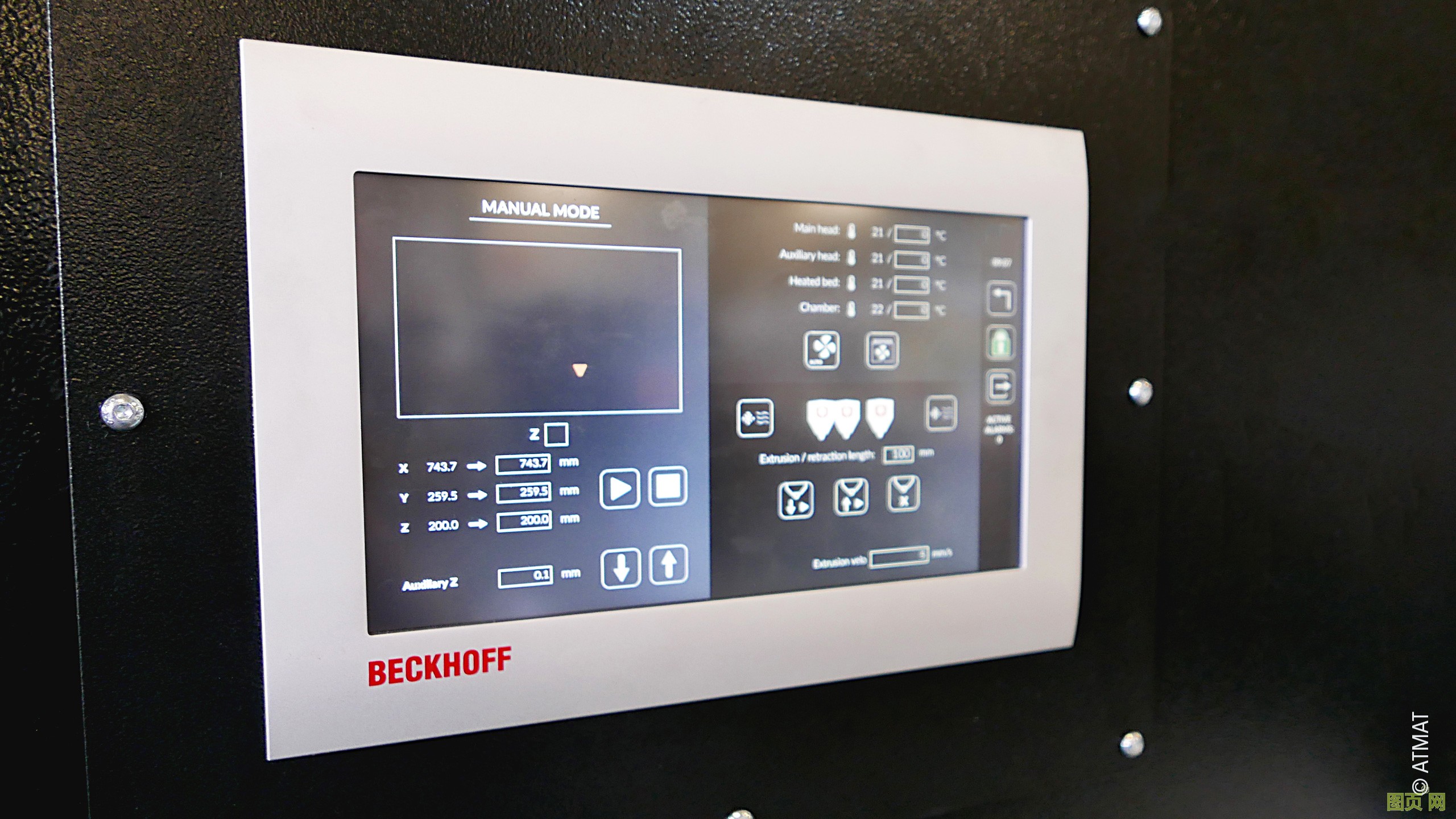 倍福還提供了所有 I/O 模塊,包括安全模塊。安全要求通過 EL6900、EL1904 和 EL2904 TwinSAFE 端子模塊實現(xiàn)。用于監(jiān)測擠出機頭、工作臺和腔體溫度的特殊傳感器也使用了相應(yīng)的 EtherCAT 端子模塊?!皽囟日{(diào)節(jié)對 FDM 打印機的熔融分層具有決定性意義,因為它能夠確保打印件的質(zhì)量。”Robert Grolik 在解釋端子模塊對打印過程的重要性時說道。ATMAT 的自動化專家們還想到了另一個對確保良好打印效果至關(guān)重要的解決方案:他們使用激光傳感器測量打印頭和工作臺之間的距離,從而提高打印質(zhì)量,尤其是在打印第一層材料時。