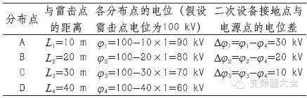 三個(gè)設(shè)備外殼電位分別為:φ(A,B,C)=IR-L(1,2,3)ε;而電源的電位為:φD=IR-L4ε;設(shè)備外殼與電源電位差為:Δφ=φ(A,B,C)-φD。其中ε為電壓降常數(shù)1kV/m。