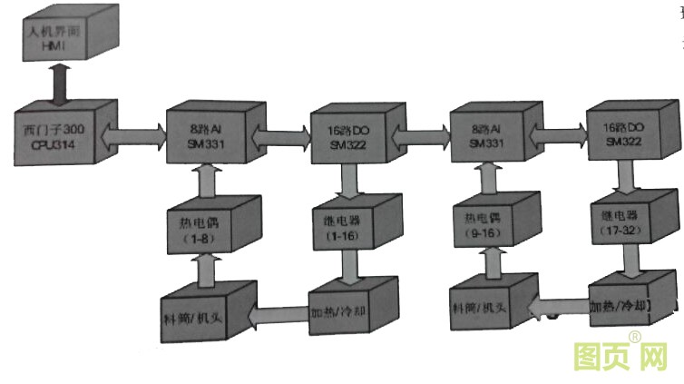 傳統(tǒng)的控制方式有離散式溫控儀表控制和PLC集中控制兩種,第一種方式不具備集中控制的意義,故不作分析。以西門子S7-300PLC構(gòu)成16個溫區(qū)的集中控制系統(tǒng)硬件配置如圖所示。