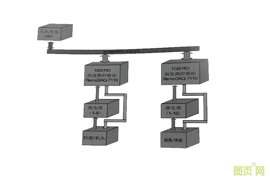 由圖中可以看出,由于模塊每回路均帶有熱電偶采集,加熱、冷卻開關(guān)量輸出。因此,只需要配置2個模塊。各看見塊可獨立的控制對應(yīng)回路的溫度值,CPU只需通過現(xiàn)場總線就可以輕松的控制各回路的開閉及獲取各回路當前溫度設(shè)定溫度值。因此系統(tǒng)硬件和軟件大大簡化系統(tǒng)的控制精度可靠性、穩(wěn)定性大幅進步。如下圖所示。