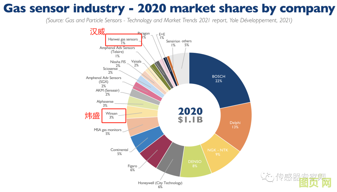 漢威科技是國內(nèi)最早從事氣體傳感器研究、生產(chǎn)的廠家之一,目前漢威科技已經(jīng)成為中國最大的氣體傳感器廠商,產(chǎn)銷量占國內(nèi)氣體傳感器市場75%,市場份額方面,根據(jù)Yole的數(shù)據(jù)顯示,漢威科技(含旗下煒盛電子)占全球氣體傳感器市場份額的4%,也是中國唯一進(jìn)入全球市場份額榜單的公司,漢威科技每年為全球近百個國家和地區(qū)提供各類傳感器及模組超3000萬支。
