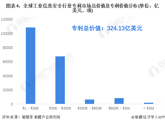 目前,從全球工業(yè)信息安全行業(yè)專(zhuān)利市場(chǎng)價(jià)值分布來(lái)看,大部分工業(yè)信息安全專(zhuān)利的市場(chǎng)價(jià)值在1-3萬(wàn)美元之間,在其余價(jià)值區(qū)間的專(zhuān)利數(shù)量為84594項(xiàng),占專(zhuān)利總量的43.88%。
