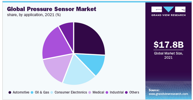 GrandView Research數(shù)據(jù)也證明了這點(diǎn):2021年全球壓力傳感器市場規(guī)模達(dá)178.1億美元,主要受益于工業(yè)大本營之外的消費(fèi)電子、汽車和便攜式可穿戴設(shè)備等對(duì)壓力傳感器需求的增長。而且,這波增長勢頭不減,自2022年至2030年,將繼續(xù)推動(dòng)全球壓力傳感器市場以4.4%復(fù)合年增長率繼續(xù)穩(wěn)步前行。