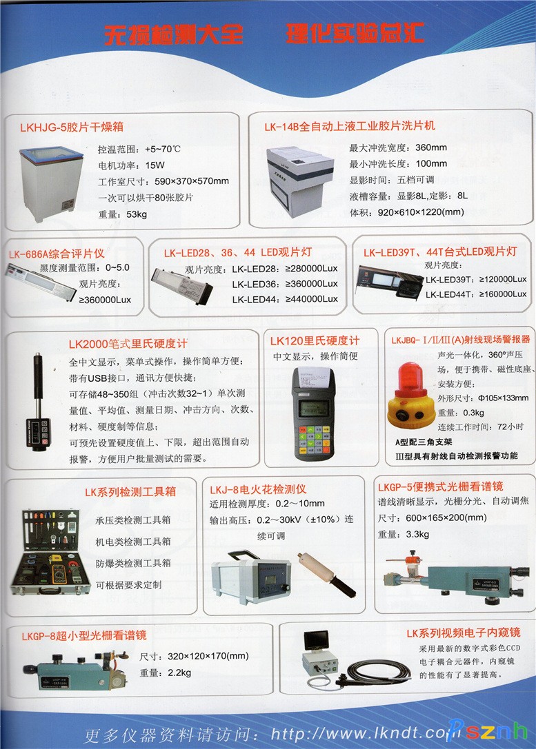 在生產(chǎn)上公司本著“以科技為先導(dǎo),以質(zhì)量求生存”的宗旨,吸收國內(nèi)外先進技術(shù),推出了:LK300、UTM系列超聲波測厚儀,CDX系列便攜式磁粉探傷儀,X射線探傷機、LK系列超聲波探傷儀、全自動洗片機、LK系列便攜式硬度計、LK系列冷光源觀片燈、LKGP系列光譜儀、JG系列電火花檢測儀、LK系列檢測工具箱、以及觀片燈,各種超聲波探頭等先進的無損檢測產(chǎn)品。本公司測厚儀主機壹年保換,終身保修,在質(zhì)量上擁有了可靠的保證,現(xiàn)公司產(chǎn)品已遍及全國各地,深受用戶好評。為答謝用戶的支持,公司還一開展了免費維修各種測厚儀活動,免維修費,免換元器件費,免反還的郵寄費,做到了真正的免費。