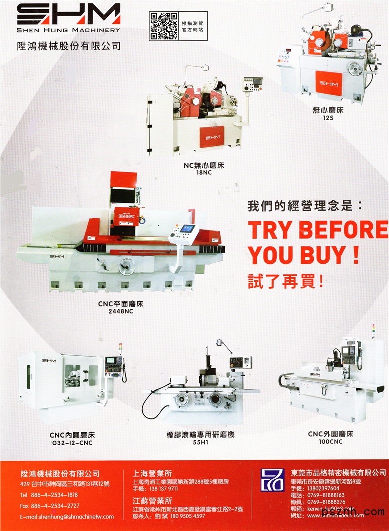 東莞市品格精密機(jī)械有限公司   陞鴻機(jī)械股份有限公司自成立以來(lái),帶著設(shè)計(jì)開(kāi)發(fā)及製作團(tuán)隊(duì),歷經(jīng)30年技術(shù)製造過(guò)程,由開(kāi)始的手動(dòng)傳統(tǒng)機(jī)械提升至目前數(shù)位化控制系統(tǒng)機(jī)械,積極研發(fā)CNC內(nèi)外圓研磨機(jī),秉持著─「TRY BEFORE YOU BUY」「試了再買(mǎi)」的經(jīng)營(yíng)理念,為顧客提供更高滿(mǎn)意度的研磨設(shè)備,我們的專(zhuān)業(yè)研發(fā)團(tuán)隊(duì),致力客製化設(shè)備研發(fā)及品質(zhì)提升,不僅產(chǎn)品能符合國(guó)際標(biāo)準(zhǔn),製造流程的每個(gè)環(huán)節(jié)亦受到嚴(yán)格控管,使研磨設(shè)備能符合客戶(hù)不同的需求,亦能達(dá)到快速交貨的目的,產(chǎn)品成功拓展至歐美、中國(guó)、日本、韓國(guó)、東南亞及內(nèi)銷(xiāo)臺(tái)灣,獲得國(guó)內(nèi)外市場(chǎng)高度回應(yīng)。