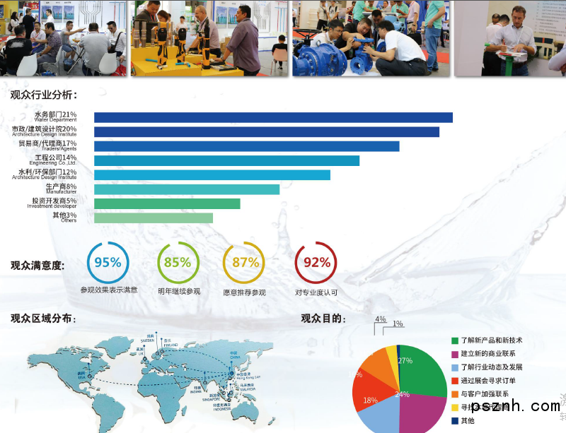 上屆展會邀請到中國建筑金屬結(jié)構(gòu)協(xié)會、中國城鎮(zhèn)供水排水協(xié)會、中國建筑學(xué)會建筑給水排水研究分會、中國建筑金屬結(jié)構(gòu)協(xié)會給水排水設(shè)備分會、華東地區(qū)給水排水技術(shù)信息網(wǎng)、中國城鎮(zhèn)供水排水協(xié)會縣鎮(zhèn)工作委員會、上海市供水行業(yè)協(xié)會、江蘇省城鎮(zhèn)供水排水協(xié)會、浙江省城市水業(yè)協(xié)會、安徽省供水行業(yè)協(xié)會、上海市排水行業(yè)協(xié)會、悉地國際設(shè)計顧問(深圳)有限公司、中國西北設(shè)計研究院有限公司、江蘇建筑設(shè)計研究院有限公司、江蘇省土木建筑學(xué)會給水排水專業(yè)委員會、浙江省勘察設(shè)計行業(yè)協(xié)會給排水專業(yè)委員會等行業(yè)權(quán)威機構(gòu)領(lǐng)導(dǎo)及代表出席大會開幕式,可謂盛況空前!共同打造2018智慧城市水資源高峰論壇暨國際給排水工程師大會及系列盛會,來自國內(nèi)外水行業(yè)的管理人員、專家學(xué)者等將針對最新政策、前沿科技作專題研討,上屆其中包括2018(第一屆)長三角三省一市一體化城鎮(zhèn)供水合作發(fā)展論壇、第五屆智慧水務(wù)建設(shè)與運行研討會、供水管網(wǎng)運行與漏損控制研討會、城鎮(zhèn)水環(huán)境治理與生態(tài)修復(fù)論壇、中國建筑給排水發(fā)展技術(shù)論壇與成本控制技術(shù)對接會等。