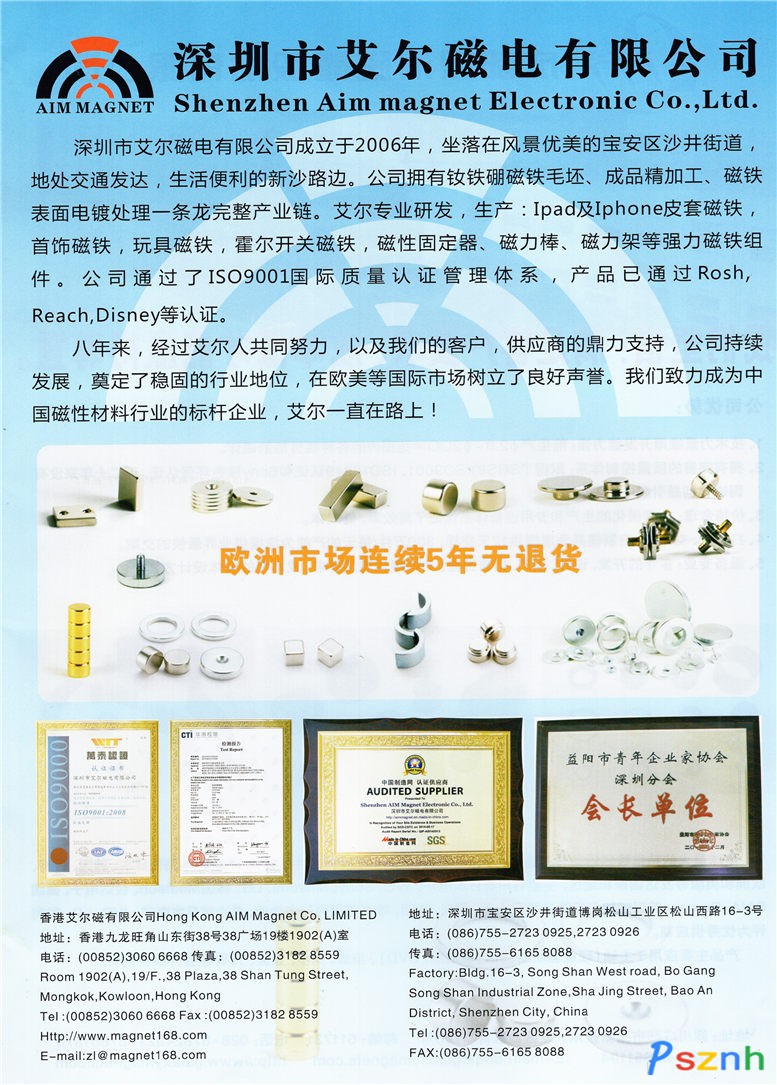 艾爾磁電產(chǎn)品主要應(yīng)用于高端數(shù)碼電子產(chǎn)品,高端皮具,智能家居,汽車配件等行業(yè)。2009年通過ISO9001國際質(zhì)量管理體系認(rèn)證,2014年通過SEDEX社會責(zé)任體系認(rèn)證,產(chǎn)品通過Rosh,Reach等環(huán)保檢測。公司歷經(jīng)10年穩(wěn)定發(fā)展,培養(yǎng)了強大的技術(shù)和服務(wù)團隊,擁有釹鐵硼強力磁鐵生產(chǎn)加工、表面電鍍處理一條龍產(chǎn)業(yè)鏈,已在業(yè)界樹立了良好的口碑,各種磁鐵和磁性材料制品已暢銷國,內(nèi)外。艾爾磁電將持續(xù)創(chuàng)造一個與員工,客戶,廠商共贏格局,致力成為磁性材料制品行業(yè)的標(biāo)桿企業(yè)。