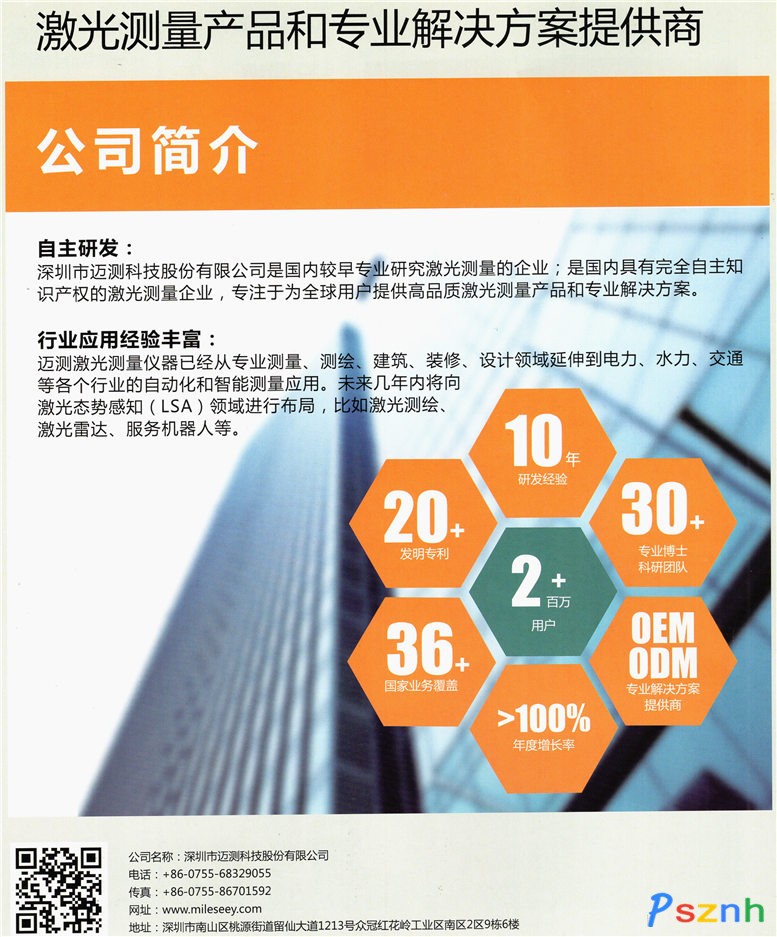 深圳市邁測科技股份有限公司是國內(nèi)較早研究和生產(chǎn)高精度手持測距儀的廠家之一,具有超過16年的行業(yè)積累,是國內(nèi)較早進入測量領(lǐng)域的一批企業(yè),目前出口銷量排行全國前三甲,已經(jīng)成為行業(yè)的先鋒部隊。合理的法人治理結(jié)構(gòu)將公司的管理層和技術(shù)精英緊密地連接在一起,形成了一個強有力的工作團隊。公司結(jié)合自身的特點,不斷汲取有效的運作模式和科學(xué)的管理方法,加強企業(yè)內(nèi)部管理,逐步建立起現(xiàn)代化的管理機制,完善了組織機構(gòu)運營體系,為客戶提供高效的服務(wù),實現(xiàn)公司的全面發(fā)展。