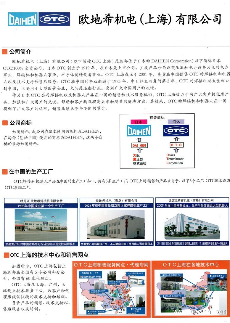 OTC 公司產(chǎn)品在中國(guó)改革開放以后,進(jìn)入中國(guó)的制造業(yè)(造船、鍋爐等)領(lǐng)域,獲得廣大用戶的好評(píng),為中國(guó)的經(jīng)濟(jì)發(fā)展做出了貢獻(xiàn)?,F(xiàn)在OTC公司在中國(guó)有1個(gè)銷售公司、3個(gè)生產(chǎn)工廠,我們?cè)诓粩嘞蚴袌?chǎng)推出新產(chǎn)品的同時(shí),也加強(qiáng)和用戶的合作,為客戶解決生產(chǎn)問題。