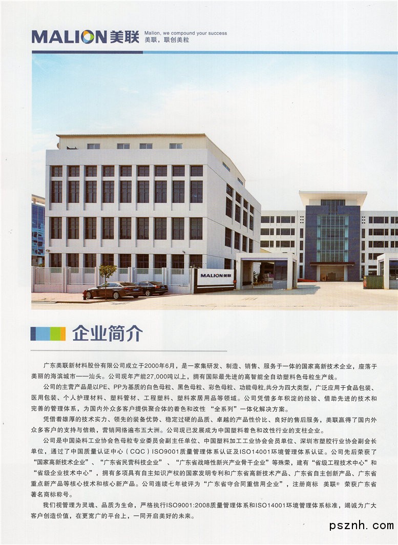 廣東美聯(lián)新材料股份有限公司是內(nèi)資企業(yè)中以色母粒為主營(yíng)產(chǎn)品的第一家上市公司,證券代碼:SZ. 300586,證券簡(jiǎn)稱:美聯(lián)新材。美聯(lián)新材成立于2000年6月,是一家集研發(fā)、制造、銷售、服務(wù)于一體的國(guó)家高新技術(shù)企業(yè),座落于美麗的海濱城市——汕頭。美聯(lián)新材現(xiàn)年產(chǎn)能33,000噸以上,擁有國(guó)際先進(jìn)的高智能全自動(dòng)塑料色母粒生產(chǎn)線。