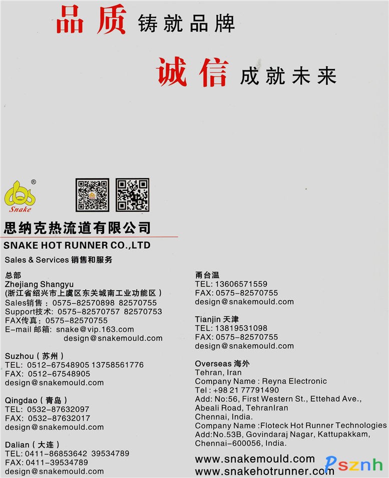 浙江思納克熱流道科技有限公司是一家專業(yè)從事注塑模熱流道系統(tǒng)設(shè)計、制作、安裝的企業(yè),注冊資本750萬元,擁有高級技術(shù)人員25人、專業(yè)售后服務(wù)人員18人,企業(yè)已經(jīng)通過ISO9001質(zhì)量管理體系認(rèn)證和CE認(rèn)證,并獲多項專利,至今已與400多家模塑企業(yè)建立了穩(wěn)定的合作關(guān)系。