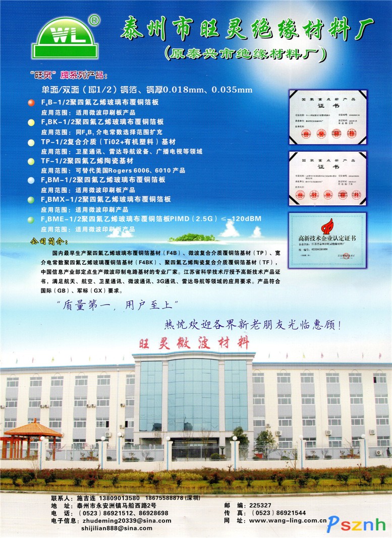 泰州市旺靈絕緣材料廠成立于一九八四年,已有三十年歷程。是微波印制電路基板的專業(yè)生產(chǎn)廠家,是在電子信息材料領(lǐng)域集科研、生產(chǎn)和經(jīng)營(yíng)于一體的經(jīng)濟(jì)實(shí)體,其主導(dǎo)產(chǎn)品有聚四氟乙烯玻璃布覆銅箔板、陶瓷填充聚四氟乙烯玻璃布覆銅箔板系列、微波復(fù)合介質(zhì)基片系列、微波多層板,微波電子器件及絕緣、防粘漆布類。廣泛應(yīng)用于航天、航空、衛(wèi)星通訊、導(dǎo)航、雷達(dá)、電子對(duì)抗、3G通信、北斗衛(wèi)星系統(tǒng)、紡織、服裝和食品等領(lǐng)域。年生產(chǎn)能力覆銅箔板1800噸、微波復(fù)合介質(zhì)基片5000平方米,多次與國(guó)家重點(diǎn)工程配套成功,受到航天、航空及中國(guó)載人航天工程辦公室等部門的表彰。榮獲“國(guó)家級(jí)重點(diǎn)新產(chǎn)品”稱號(hào)。企業(yè)2001年通過ISO9001國(guó)際質(zhì)量體系認(rèn)證。2007年通過UL認(rèn)證。