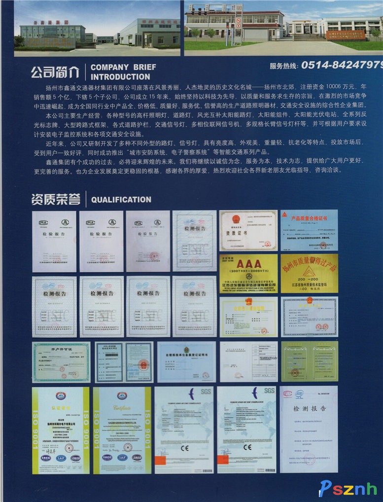 公司已通過IS09001質(zhì)量管理、IS014001環(huán)境管理、GB/T28001職業(yè)健康安全管理、CCC和CQC等管理體系認證。已取得道路照明工程二級、交通信號燈、信號控制機等多項資質(zhì)證書,并獲得“AAA級資信企業(yè)”、“重合同守信用企業(yè)”、“江蘇省名牌產(chǎn)品”等榮譽稱號。