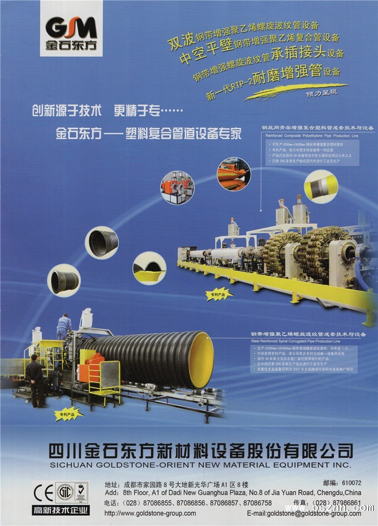 四川金石東方新材料設(shè)備股份有限公司致力于鋼增強(qiáng)塑料復(fù)合管道、真空鍍膜技術(shù)的研發(fā)和應(yīng)用,為客戶提供鋼增強(qiáng)塑料復(fù)合管、真空鍍膜全套生產(chǎn)工藝、技術(shù)解決方案及成套生產(chǎn)設(shè)備。公司集方案設(shè)計(jì)、產(chǎn)品制造、生產(chǎn)銷售、安裝調(diào)試、售后服務(wù)五位為一體。目前是中國(guó)高新技術(shù)企業(yè)、四川省企業(yè)技術(shù)中心、中國(guó)塑料加工工業(yè)協(xié)會(huì)塑料管道專委會(huì)理事單位、《特種結(jié)構(gòu)》理事單位。榮獲建設(shè)部科技促進(jìn)中心和中國(guó)化學(xué)建材協(xié)調(diào)組-塑料管道專家組共同頒發(fā)的“突出貢獻(xiàn)”獎(jiǎng)。