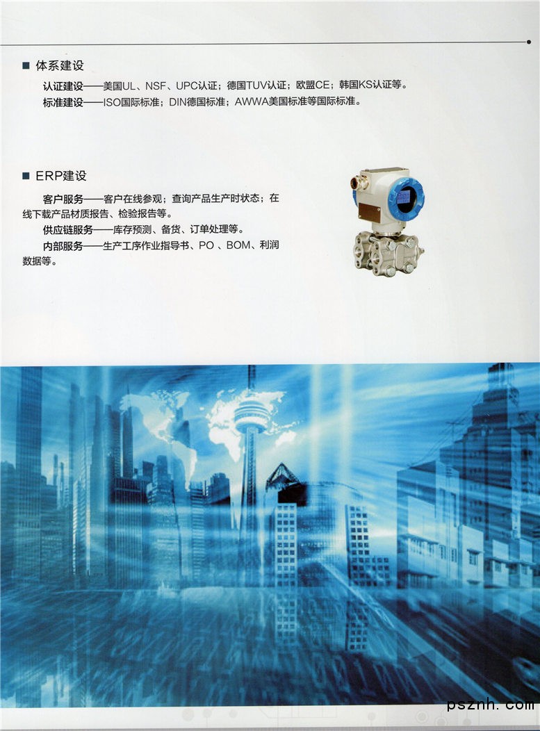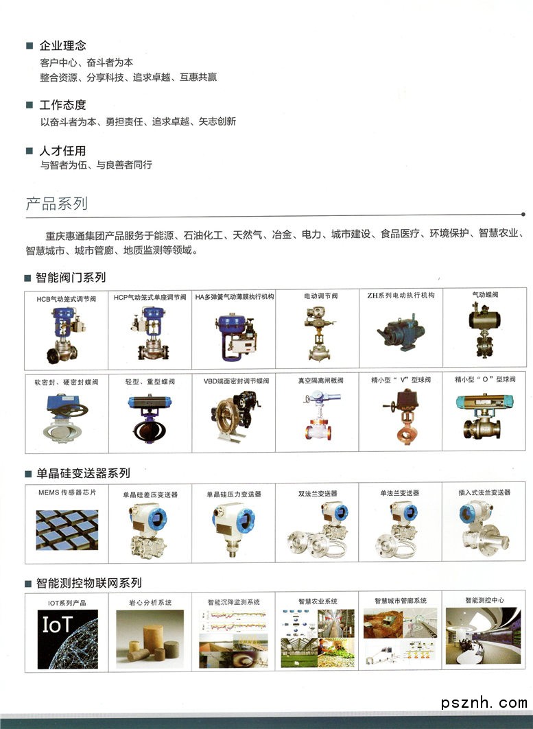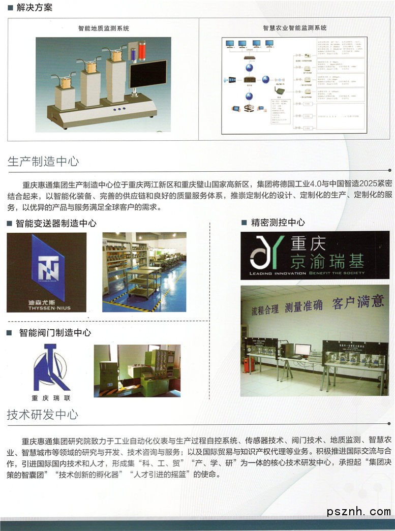 集團擁有儀器儀表研究院、重慶迪森尤斯自動化儀表有限公司,專門從事單晶硅智能變送器生產(chǎn)制造;重慶瑞聯(lián)儀器儀表有限公司,專門從事閥門生產(chǎn)制造;重慶京渝瑞基測控儀器儀表制造有限公司,專門從事精密測控設備生產(chǎn)制造;上海辰心儀表有限公司,專門從事溫度儀表生產(chǎn)制造和重慶金開惠通企業(yè)管理有限公司等。為提升企業(yè)核心競爭力,中控惠通集團一方面加強國際合作,引進德國先進技術;另一方面拓寬產(chǎn)品行業(yè)領域,產(chǎn)品不僅服務于傳統(tǒng)的能源、石油化工、天然氣、冶金、電力,城市建設,更向環(huán)保、智慧農(nóng)業(yè)、智慧城市、城市管廊、防災減災等領域發(fā)展。