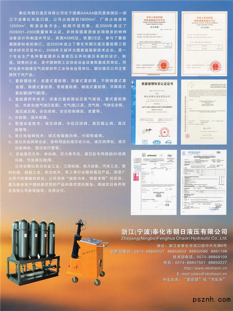 公司擁有高素質的專業(yè)技術人員,制造設備齊全,檢測手段完善,并建立了朝日液壓蓄能器工程技術中心,進行新產品研發(fā)。在2000年通過了ISO9001質量管理體系認證,并持有國家質量監(jiān)督檢驗檢疫總局頒發(fā)的特種設備設計、制造許可證(A1級壓力容器),許可證編號:TS1210417和TS2210185;美國ASME“U”級壓力容器設計制造證書和歐共體執(zhí)行PED指令的CE(B+F)許可證。公司連續(xù)五年被奉化市技術監(jiān)督局評為“產品質量信得過企業(yè)”。在2001年被評為浙江省中小企業(yè)“質量管理先進企業(yè)”的榮譽稱號,2008年被認定為國家級高新技術企業(yè)。