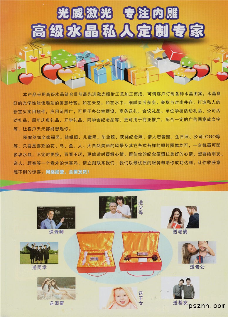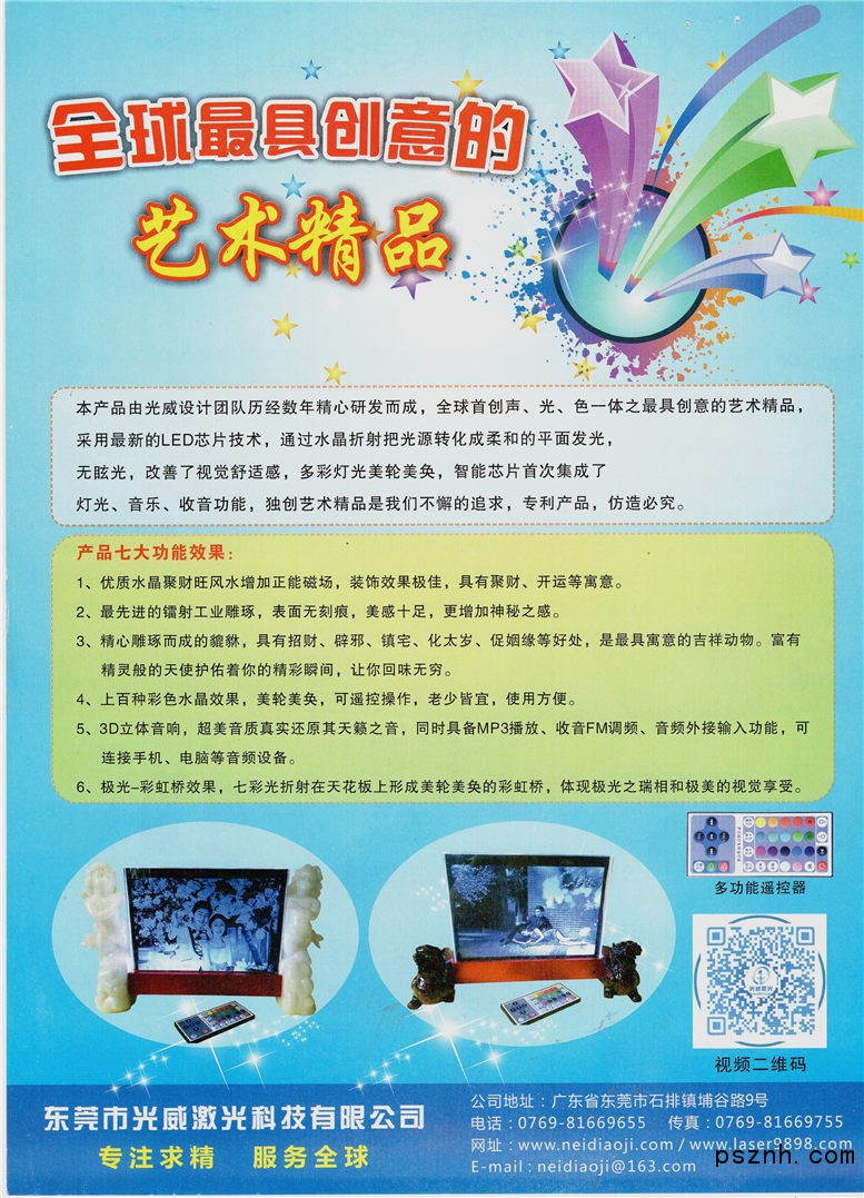 東莞市光威激光科技公司,打破常規(guī),突破內雕禮品行業(yè)應用局限,始終如一的專注工業(yè)激光應用,憑著精湛的技術和嚴格的管理,秉誠“專業(yè)服務,專注求精”的經營理念,目前已經成為工業(yè)內雕應用的領航者!目前給飛利浦、創(chuàng)維、格力、TCL、魅族、勁勝股份、步步高、新銳股份、雷士照明、華裕燈飾、萬德集團、惠妮集團、方正等國內外多家知名企業(yè)提供內雕技術支持,開發(fā)多款新設備新產品!特別是亞克力內雕的效果,能與水晶媲美(潔白、精細),多次受到國內外權威專家的肯定和支持!