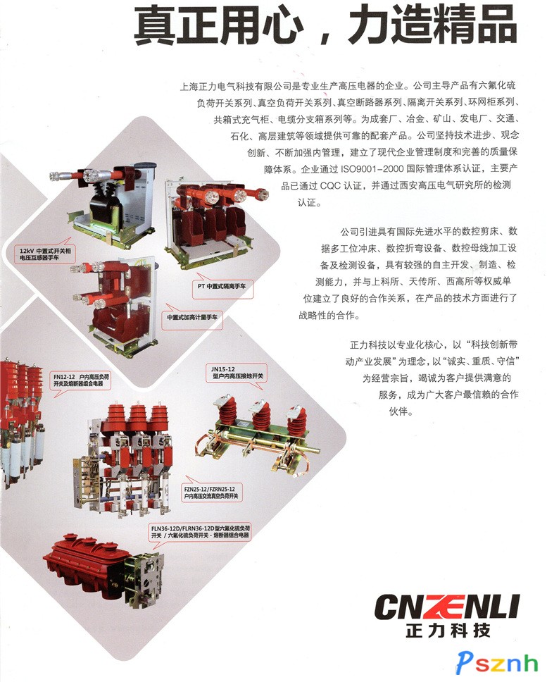 上海正力電氣科技有限公司是專業(yè)生產(chǎn)高壓電器的企業(yè)。公司主導(dǎo)產(chǎn)品有六氟化硫負(fù)荷開關(guān)系列、真空負(fù)荷開關(guān)系列、真空斷路器(高壓真空斷路器)系列、隔離開關(guān)系列、環(huán)網(wǎng)柜系列、共箱式充氣柜、電纜分支箱系列、接地開關(guān)系列、PT手車等產(chǎn)品。為成套廠、冶金、礦山、發(fā)電廠、交通、石化、高層建筑等領(lǐng)域提供可靠的配套產(chǎn)品。公司堅(jiān)持技術(shù)進(jìn)步、觀念創(chuàng)新、不斷加強(qiáng)內(nèi)管理,建立了現(xiàn)代企業(yè)管理制度和完善的質(zhì)量保障體系。企業(yè)通過ISO9001-2000國(guó)際管理體系認(rèn)證,主要產(chǎn)品已通過CQC認(rèn)證,并通過西安高壓電氣研究所的檢測(cè)認(rèn)證。