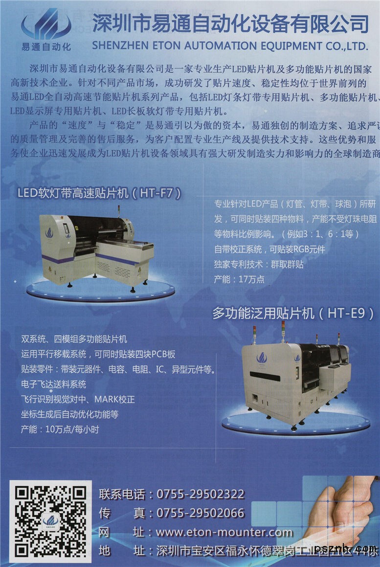 易通公司產品就產能而言,堪稱目前全球速度最快的貼片機,“ET”、“HT”系列LED貼片機實際產能已高達120000CPH??筛鶕?jù)客戶要求訂做產品,五米燈帶也可達到120000CPH。一些上市公司包括木林森、領航、奧其斯、長方、萬潤科技、福建珈偉、日上光電、江蘇亞明、世紀經典、珠海韜博、惠州國展電子等都已經成為我們的客戶。