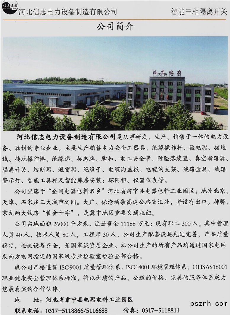 公司坐落于國家命名的“全國電器電料名鄉(xiāng)”河北肅寧電器電料工業(yè)園區(qū);地處北京、天津、石家莊三大城市之間。大廣、保滄兩條高速公路在公司北一公里處交匯,并設有出口。神驊、京九兩大鐵路在本公司10公里處交叉過境。被譽為“黃金十字”,是冀中地區(qū)重要交通樞紐。 公司占地面積26000平方米,注冊資金3108萬元;現(xiàn)有職工125人,其中管理人員12人,技術人員18人,工程師8人,公司生產(chǎn)配套設施先進完善,產(chǎn)品質量穩(wěn)定,檢測設備齊全,是資質企業(yè)。本公司生產(chǎn)的高壓熔斷器、隔離開關、避雷器等產(chǎn)品通過西安高壓電器研究院有限責任公司檢測全部合格,絕緣子通過(北京)電力工業(yè)電力設備及儀表質量檢驗測試中心檢測全部合格,安全工器具通過蘇州電器科學學研究院股份有限公司、電力工業(yè)電力安全工器具質量監(jiān)督檢驗測試中心檢驗全部合格。