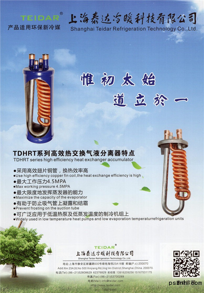 上海泰達冷暖科技有限公司專注于高品質制冷與空調系統(tǒng)零部件的研發(fā)、制造及銷售業(yè)務。擁有自主進出口權,品牌:TEIDAR,浙江生產基地通過ISO9001:2008管理體系認證和獲得小型壓力容器生產許可證。憑借十多年的從業(yè)經驗,先進的制造設備和嚴格的質量控制管理體系,我們的產品具有環(huán)保、高效可靠、規(guī)格齊全、易安裝使用等特點,廣泛應用于壓縮機保護裝置和油路管理控制系統(tǒng),主要包括:過濾器(干燥過濾器、吸氣過濾器)、油路管理控制系統(tǒng)(油位控制器、油分離器、儲油器、油壓差單向閥、油過濾器)、閥(球閥、單向閥、截止閥、卸荷閥、節(jié)流閥、引射器)、電磁閥(三通熱回收電磁閥、三通熱氣除霜閥、常閉膜片/活塞電磁閥、卸載電磁閥)、壓力容器(氣液分離器、儲液器、熱交換器)、其他保護裝置(視液鏡、減震管、壓力表)、黃銅及紫銅接頭、管組件。