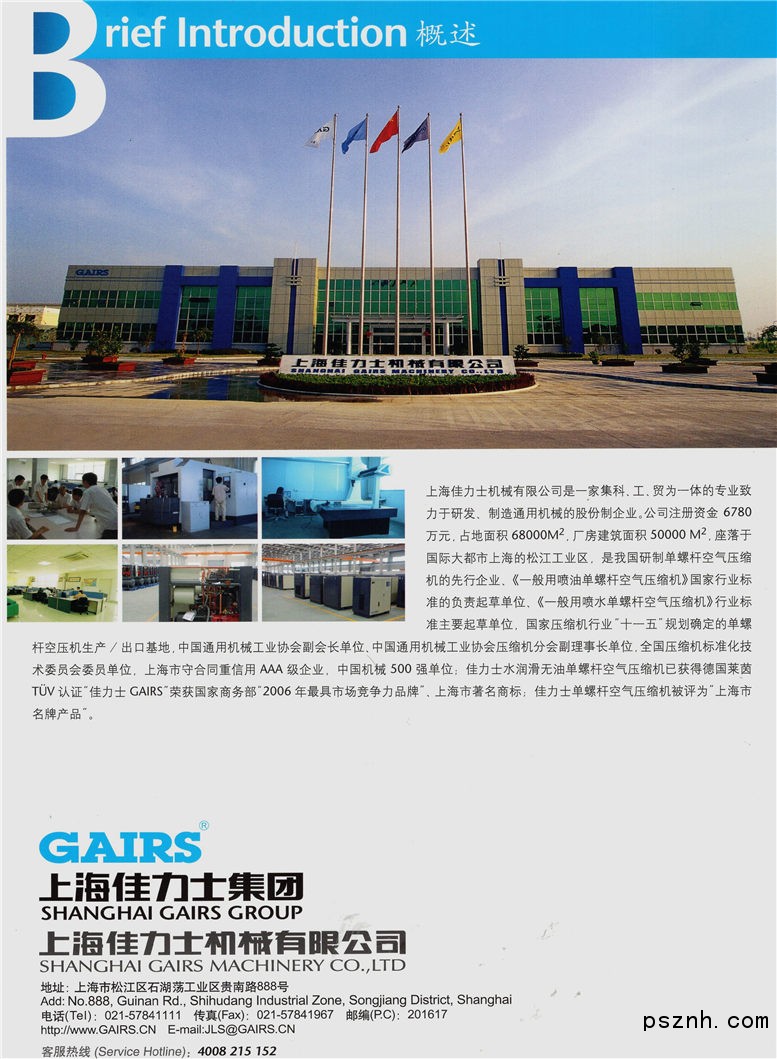 上海佳力士機械有限公司是一家集科、工、貿(mào)為一體的專業(yè)致力于研發(fā)、制造通用機械的股份制企業(yè)。公司注冊資金 6780萬元,占地面積68000M²,廠房建筑面積50000 M²,座落于國際大都市上海松江工業(yè)區(qū),是我國研制單螺桿空氣壓縮機的先行企業(yè)、《一般用噴油單螺桿空氣壓縮機》國家行業(yè)標準的負責起草單位、《一般用噴水單螺桿空氣壓縮機》行業(yè)標準主要起草單位,國家壓縮機行業(yè)“十一五”規(guī)劃確定的單螺桿空壓機生產(chǎn)/出口基地,中國通用機械工業(yè)協(xié)會副會長單位、中國通用機械工業(yè)協(xié)會壓縮機分會副理事長單位,全國壓縮機標準化技術委員會委員單位,全國守合同重信用企業(yè),中國機械500強單位;“佳力士GAIRS”榮獲國家商務部“2006年最具市場競爭力品牌”、上海市著名商標;佳力士單螺桿空氣壓縮機榮獲上海市名牌產(chǎn)品;佳力士水潤滑無油單螺桿空氣壓縮機獲得德國萊茵TÜV認證。