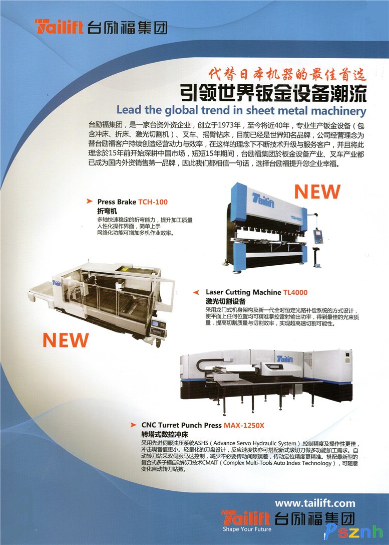臺(tái)勵(lì)福集團(tuán)為領(lǐng)導(dǎo)全球物流機(jī)械專業(yè)制造廠之一,主要產(chǎn)品有物流機(jī)械包含電動(dòng)拖板車、叉車、窄道式叉車、牽引車、四向橫移式叉車、越野式叉車等。另外鈑金設(shè)備主要產(chǎn)品有CNC電腦數(shù)控沖床、激光切割機(jī)、折彎?rùn)C(jī)、工具機(jī)以及搖臂鉆床等。
