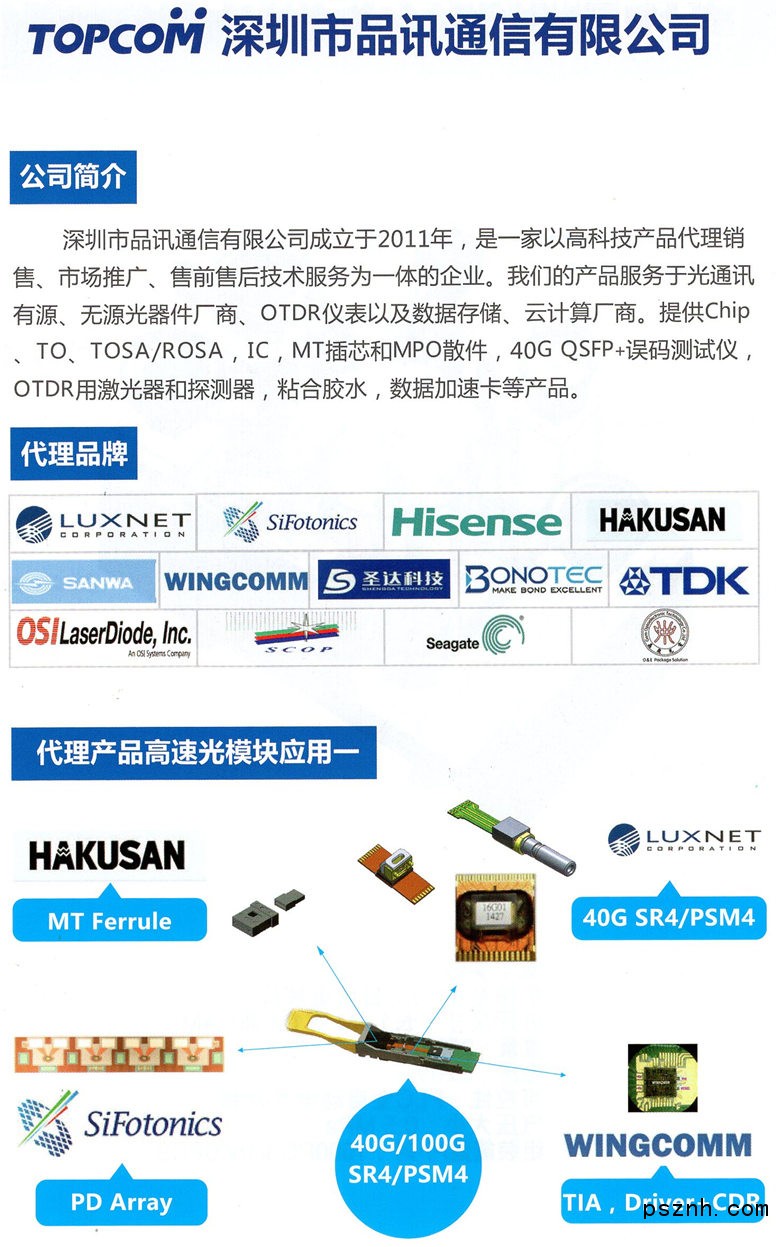 Topcom成立于2011年,是一家以高科技產(chǎn)品代理銷售、市場(chǎng)推廣、售前售后技術(shù)服務(wù)為一體的企業(yè)。我們的產(chǎn)品服務(wù)于光通訊有源、無源光器件廠商、OTDR儀表廠商以及數(shù)據(jù)存儲(chǔ)、云計(jì)算廠商。提供Chip、TO、TOSA/ROSA,單、多模MT插芯和散件,40G QSFP+誤碼測(cè)試儀,OTDR儀表用激光器和探測(cè)器,自動(dòng)化生產(chǎn)設(shè)備,粘合膠水,數(shù)據(jù)加速卡等產(chǎn)品。