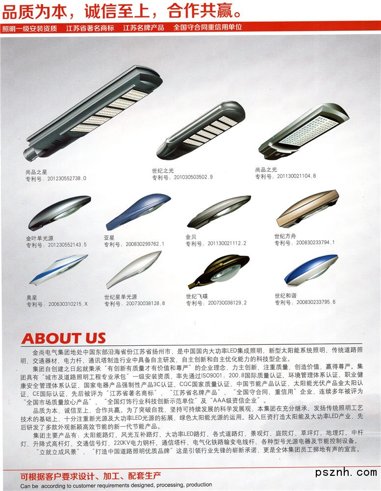 金尚電氣集團(tuán)地處中國東部沿海省份江蘇省揚(yáng)州市,是中國國內(nèi)大功率 LED集成照明、新型太陽能系統(tǒng)照明、傳統(tǒng)道路照明、交通器材、電力桿、通訊塔制造行業(yè)中具備自主研發(fā),自主創(chuàng)新和自主優(yōu)化能力的科技型企業(yè)。投資一億五千萬元,下設(shè)揚(yáng)州金源燈飾有限公司、揚(yáng)州市遠(yuǎn)景照明有限公司、揚(yáng)州金源市政工程有限公司、揚(yáng)州金源照明設(shè)計(jì)有限公司、江蘇尚品交通器材有限公司、江蘇尚品光電有限公司共六家分公司。 集團(tuán)自創(chuàng)建之日起就秉承“有創(chuàng)新有質(zhì)量才有價(jià)值和尊嚴(yán)”的企業(yè)理念,力主創(chuàng)新,注重質(zhì)量,創(chuàng)造價(jià)值,贏得尊嚴(yán)。多年來,一直致力于新能源新材料和新光源的開發(fā)研制,不斷吸收國內(nèi)外同行的先進(jìn)制造技術(shù),加工工藝和管理理念。憑借雄厚的資金實(shí)力,完備的生產(chǎn)能力,一流的研發(fā)團(tuán)隊(duì),精益求精的售后服務(wù)機(jī)制贏得了廣大客商的信賴。產(chǎn)品遍銷中國國內(nèi),遠(yuǎn)銷俄羅斯、中東、歐美等地區(qū)。 集團(tuán)具有“城市及道路照明工程專業(yè)承包”一級(jí)安裝資質(zhì),率先通過 ISO9001:2008國際質(zhì)量認(rèn)證、環(huán)境管理體系認(rèn)證、職業(yè)健康安全管理體系認(rèn)證、國家電器產(chǎn)品強(qiáng)制性產(chǎn)品3C認(rèn)證、CQC國家質(zhì)量認(rèn)證、中國節(jié)能產(chǎn)品認(rèn)證、太陽能光伏產(chǎn)品金太陽認(rèn)證、CE國際認(rèn)證、先后被評(píng)為“江蘇省著名商標(biāo)”、“江蘇省產(chǎn)品”、“全國守合同、重信用”企業(yè),連續(xù)多年被評(píng)為“全國市場質(zhì)量放心產(chǎn)品”、“全國燈飾行業(yè)科技創(chuàng)新示范單位”及“AAA級(jí)資信企業(yè)”。 經(jīng)過多年的高速發(fā)展,集團(tuán)現(xiàn)已成為集開發(fā)、設(shè)計(jì)、制造和安裝為一體的專業(yè)化、規(guī)?;闹圃焐?。占地面積達(dá) 60000平方米,擁有技術(shù)員工 300余人。擁有多套雙聯(lián)數(shù)控大型折彎機(jī),數(shù)控注塑機(jī),大型燈具壓鑄機(jī),液壓拉伸機(jī)及粉末靜電噴涂流水線,大功率 LED生產(chǎn)流水線,LED光、色、電檢測設(shè)備等先進(jìn)設(shè)備。 品質(zhì)為本,誠信至上,合作共贏。為了突破自我,堅(jiān)持可持續(xù)發(fā)展的科學(xué)發(fā)展觀,本集團(tuán)在充分繼承、發(fā)揚(yáng)傳統(tǒng)照明工藝技術(shù)的基礎(chǔ)上,十分注重新光源及大功率 LED光源的拓展,綠色太陽能光源的運(yùn)用。投入巨資打造太陽能及大功率 LED產(chǎn)業(yè),先后研發(fā)了多款外觀新穎高效節(jié)能的新一代節(jié)能產(chǎn)品。 集團(tuán)主要產(chǎn)品有:太陽能路燈、風(fēng)光互補(bǔ)路燈、大功率 LED路燈、各式道路燈、景觀燈、庭院燈、草坪燈、地埋燈、中桿燈、升降式高桿燈、交通信號(hào)燈、220KV電力鋼桿、通信塔桿、電氣化鐵路輸變電線桿、各種型號(hào)光源電器及節(jié)能控制設(shè)備。滿足需要,提供零缺陷產(chǎn)品”。金尚集團(tuán)在全國各地與各級(jí)黨政機(jī)關(guān)、照明專家、承建商和各級(jí)營銷商都有著廣泛深入的合作,在提供優(yōu)質(zhì)領(lǐng)先產(chǎn)品的同時(shí),也為顧客提供一流的照明設(shè)計(jì)方案和科學(xué)的設(shè)計(jì)理念。設(shè)計(jì)和制造過程強(qiáng)調(diào)品質(zhì)標(biāo)準(zhǔn)的同一性,器件結(jié)構(gòu)的完整性,造型地域文化的多樣性,亮化與美化的藝術(shù)性。曾先后參與多項(xiàng)國內(nèi)外大型亮化工程的建設(shè)。