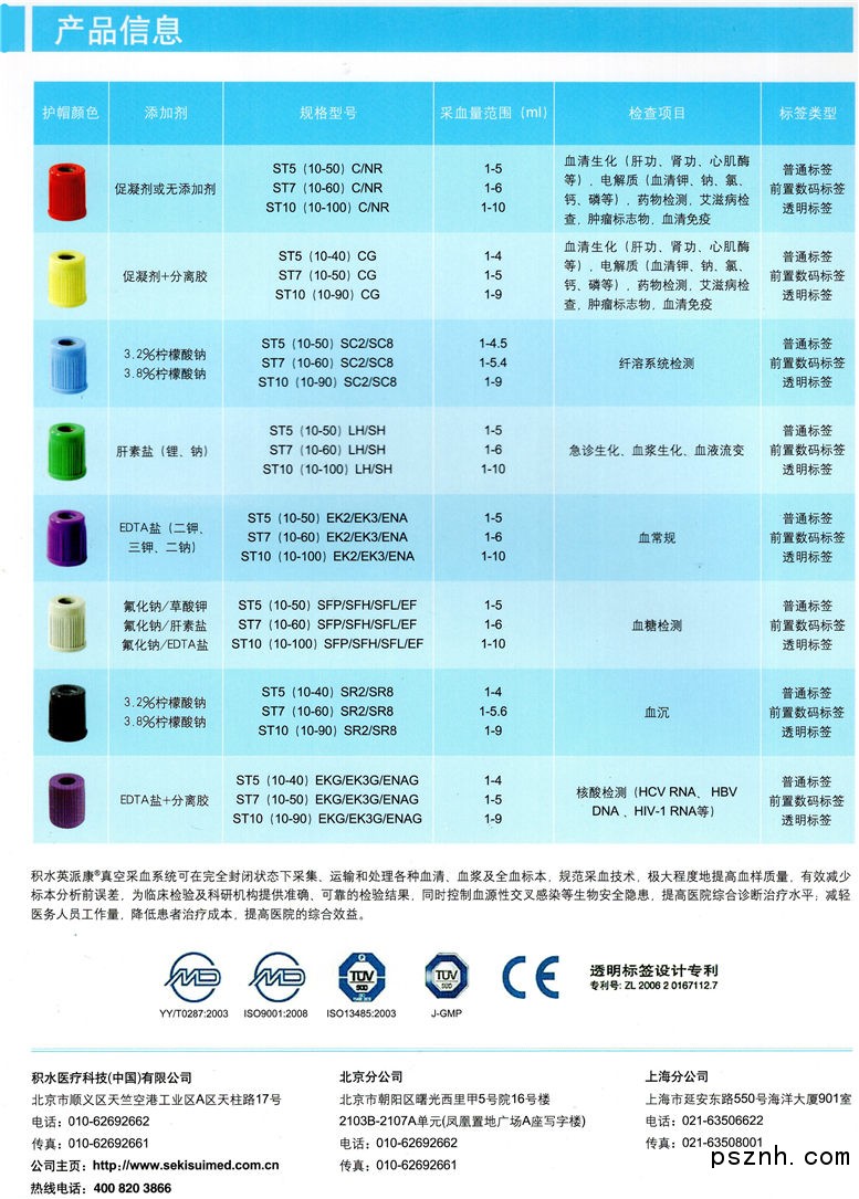 北京積水創(chuàng)格醫(yī)療科技有限公司是由日本積水化學(xué)工業(yè)株式會(huì)社與國(guó)內(nèi)上市企業(yè)中青旅控股股份有限公司于2003年共同組建的合資公司,公司注冊(cè)資本1200萬(wàn)美元,總投資2900萬(wàn)美元。積水化學(xué)工業(yè)株式會(huì)社從1985年即開始生產(chǎn)PET真空采血管,是世界上最早生產(chǎn)塑料真空采血管的廠家,具有獨(dú)自尖端的生產(chǎn)技術(shù),特別是PET原管制造裝置、血清分離劑填充裝置、藥劑分注裝置等是積水化學(xué)經(jīng)過(guò)多年研究開發(fā)的高度專業(yè)化的精密儀器。積水創(chuàng)格生產(chǎn)的英派康(INSEPACK)真空采血系統(tǒng),所用制劑和分離膠等的所有原材料均由積水化學(xué)工業(yè)株式會(huì)社自主開發(fā)研制。強(qiáng)大的技術(shù)實(shí)力為英派康(INSEPACK)真空采血產(chǎn)品走向世界、服務(wù)醫(yī)療奠定了堅(jiān)實(shí)的基礎(chǔ)。2010年2月,“北京積水創(chuàng)格醫(yī)療科技有限公司”獨(dú)資化,成為積水化學(xué)工業(yè)株式會(huì)社完全投資的“積水醫(yī)療科技(中國(guó))有限公司”。