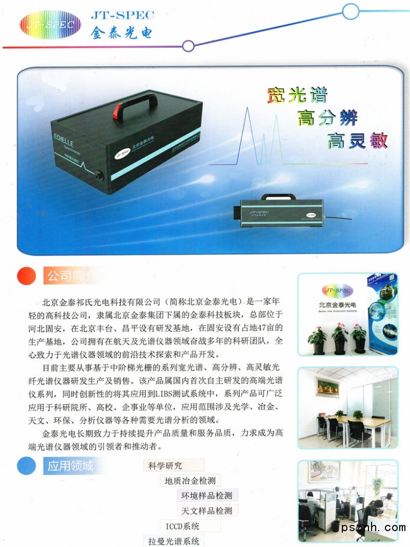北京金泰祁氏光電科技有限公司(簡(jiǎn)稱北京金泰光電)是一家年輕的高科技公司,隸屬北京金泰集團(tuán)下屬的金泰科技板塊,總部位于河北固安,在北京豐臺(tái)、昌平設(shè)有研發(fā)基地,在固安設(shè)有占地47畝的生產(chǎn)基地,公司擁有在航天及光譜儀器領(lǐng)域奮戰(zhàn)多年的科研團(tuán)隊(duì),團(tuán)隊(duì)成員全部擁有碩士以上學(xué)歷,全心致力于光譜儀器領(lǐng)域的前沿技術(shù)探索和產(chǎn)品開發(fā),目前主要從事基于中階梯光柵的系列寬譜高分辨、高靈敏光纖光譜儀器研發(fā)生產(chǎn)及銷售,該產(chǎn)品屬國(guó)內(nèi)首次自主研發(fā)的基于中階梯光柵的商用光纖光譜儀,同時(shí)創(chuàng)新性的將其應(yīng)用到LIBS測(cè)試系統(tǒng)中,系列產(chǎn)品可廣泛應(yīng)用于科研院所、高校、企事業(yè)等單位,應(yīng)用范圍涉及光學(xué)、冶金、材料、化工、分析儀器等各種需要光譜分析的領(lǐng)域。金泰光電長(zhǎng)期致力于全面、持續(xù)提升產(chǎn)品和服務(wù)品質(zhì),實(shí)現(xiàn)全方位價(jià)值的最大化,力求成為光譜儀器領(lǐng)域的引領(lǐng)者和推動(dòng)者。