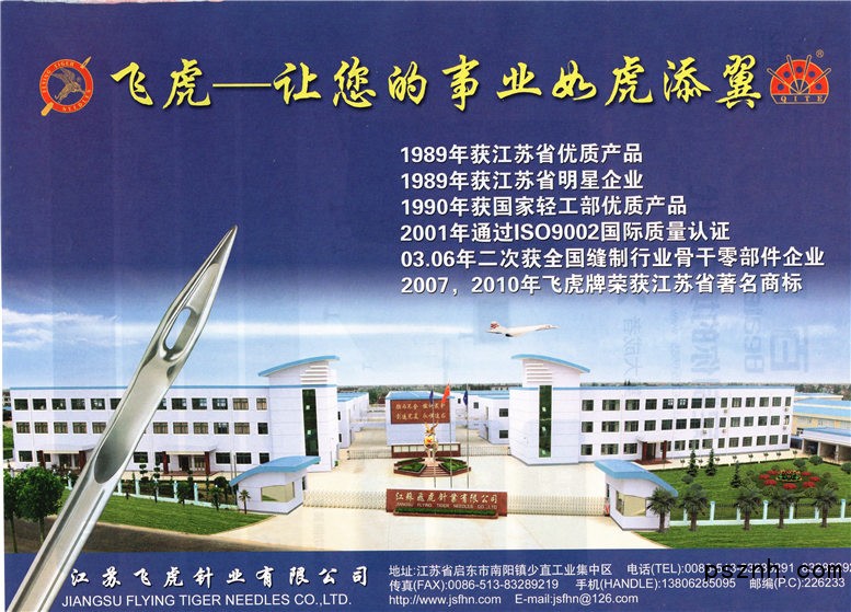 江蘇飛虎針業(yè)有限公司(原啟東市縫紉機針廠)成立于1976年,到今天已發(fā)展成為一個擁有員工500多名、占地面積37000平方米、建筑面積30000平方米、年產(chǎn)各種機針近7億枚、是目前國內(nèi)機針產(chǎn)量最大的一個企業(yè),企業(yè)注冊資本五百萬人民幣,公司性質(zhì)是股份制企業(yè),產(chǎn)品質(zhì)量在國內(nèi)同行中名列前茅,一躍成為全國制針行業(yè)的龍頭老大。公司創(chuàng)立的“飛虎”、“奇特”品牌機針暢銷全國各地、遠銷海外,深得用戶的青睞,在國內(nèi)外享有一定的聲譽。公司也先后獲得了“省明星企業(yè)”、“江蘇省優(yōu)質(zhì)產(chǎn)品”、“江蘇省著名商標”、“國家輕工部優(yōu)質(zhì)產(chǎn)品”等榮譽稱號并在2001年2月通過ISO9002國際質(zhì)量認證。在2003年及2006年,兩次作為全國唯一一家機針生產(chǎn)企業(yè)入選“中國縫制機械行業(yè)骨干零部件企業(yè)”,并成為“中國縫制機械協(xié)會零部件專業(yè)委員會副主任單位”。