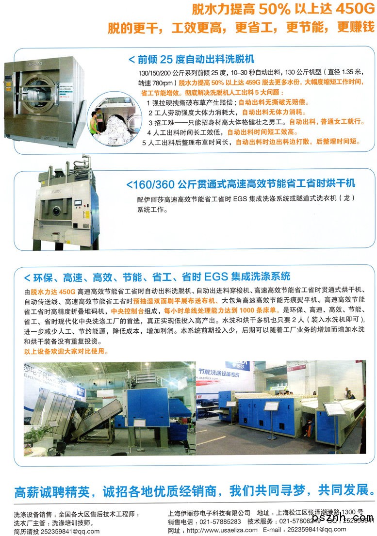 上海伊麗莎電子科技有限公司現(xiàn)主要產(chǎn)品有集成洗衣系統(tǒng)(龍)前后25度雙向傾斜20秒自動進(jìn)出料重型高級工業(yè)洗脫機(jī),全封閉前傾20秒自動出料U型風(fēng)道高速、高效、節(jié)能烘干機(jī),隔離式洗脫機(jī),業(yè)內(nèi)最先進(jìn)性能最穩(wěn)定分離式軸系的全自動大容量重型洗脫兩用機(jī),更先進(jìn)的高速無痕兩面燙熨平機(jī),高速高精度折疊機(jī),自動包裝機(jī),堆碼機(jī),打碼機(jī),夾機(jī)和隧道式烘干機(jī)。環(huán)保型干洗機(jī),代替干洗的新一代洗衣機(jī),產(chǎn)品廣泛應(yīng)用于賓館、大酒店、醫(yī)院、大企業(yè)集團(tuán)、微電子、藥廠、煤礦、大型中央洗滌工廠等企事業(yè)單位洗衣房和干洗公司(店)。