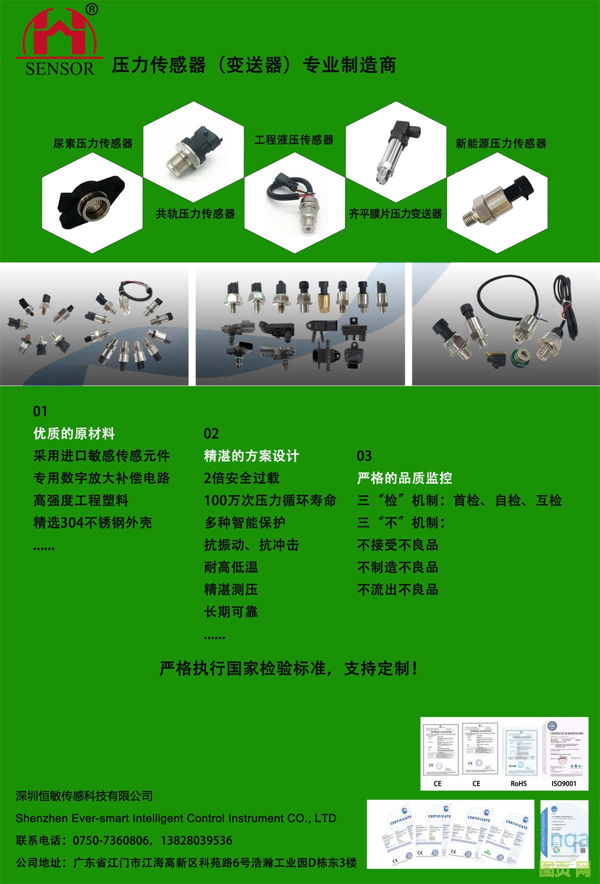 江門恒敏智控儀表有限公司是專業(yè)生產(chǎn)汽車壓力傳感器、民用壓力傳感器、工業(yè)壓力變送器、數(shù)顯壓力表、壓力控制器、壓力報(bào)警器產(chǎn)品領(lǐng)域的廠家,是傳感器行業(yè)的創(chuàng)新者。