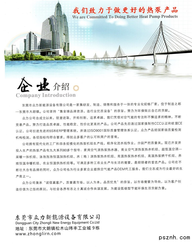 眾力新能源公司擁有現(xiàn)代化的工廠和多條智能化熱泵、熱水機(jī)組生產(chǎn)線,實(shí)現(xiàn)了程序化流水線作業(yè),分段嚴(yán)把質(zhì)量關(guān)。公司先后推出家用系列,商用系列,低溫系列,特種設(shè)備系列等60多種規(guī)格空氣源節(jié)能設(shè)備。在不斷壯大自有品牌的同時(shí),眾力新能源公司也為行業(yè)多家企業(yè)提供OEM代工服務(wù),我們立志5年內(nèi)成為行業(yè)一線廠家。