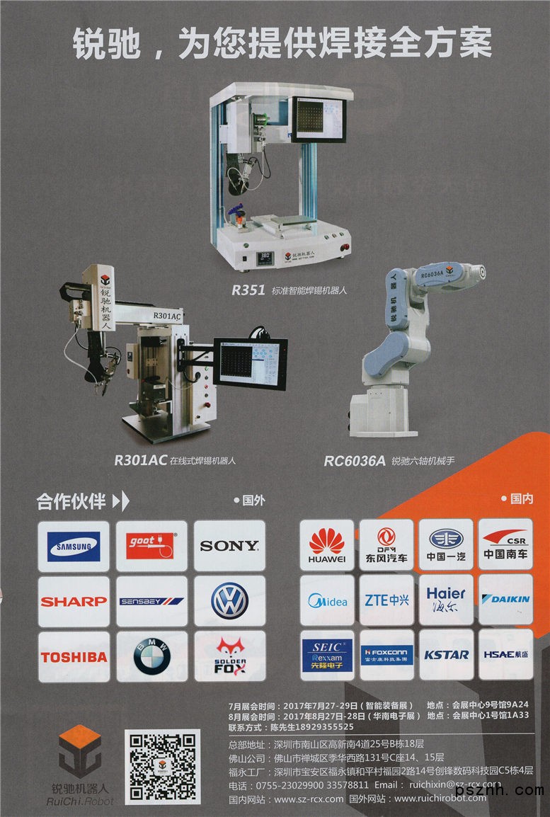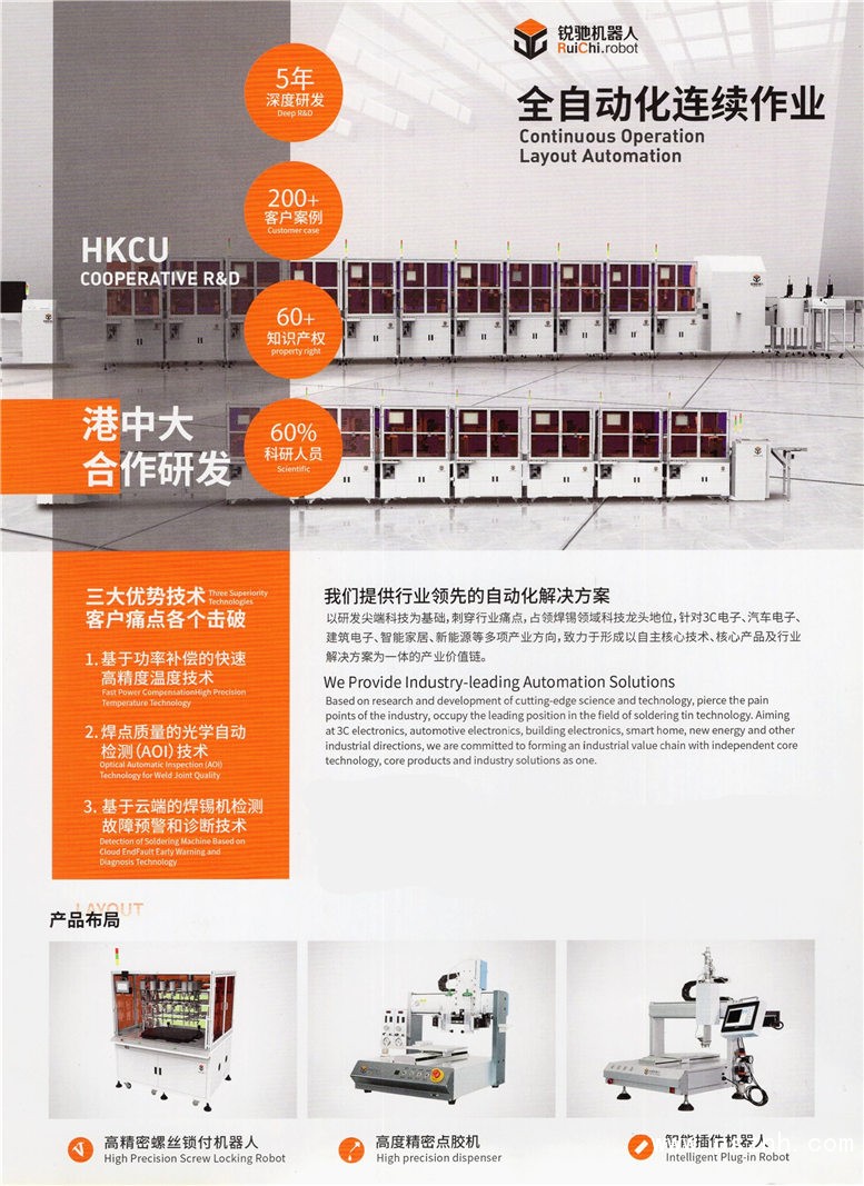 銳馳機器人(深圳)有限公司(原深圳市銳馳鑫科技有限公司)是一家集研發(fā)、生產(chǎn)、銷售于一體的專注于自動化領域的高新科技企業(yè),公司與香港中文大學在深圳市南山區(qū)科技園香港中文大學研究院合作研發(fā)焊錫機機器人和自動化系統(tǒng)。公司專業(yè)領域涉及:智能焊錫、鎖螺絲、點膠機器人,貼標、捆扎、碼垛機器人,智能裝配、測試、包裝生產(chǎn)線,3D視覺系統(tǒng)、多軸運動控制系統(tǒng)及3C機器人應用,能為國防、科研、工業(yè)等領域提供先進的自動化解決方案。 公司擁有卓越的技術研發(fā)團隊,在自動化焊接與自動化裝配領域擁有豐富的經(jīng)驗,并長期致力于自動化焊接工藝、自動化裝配工藝、機械智能等方面的研究與應用;同時,公司與香港中文大學長期保持良好的科研合作關系,不斷地研發(fā)智能機器人新產(chǎn)品系列,以滿足更多客戶的生產(chǎn)需求。