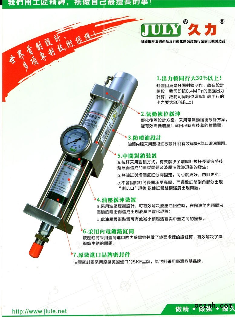 東莞市巨力氣動(dòng)液壓設(shè)備有限公司,是一家專業(yè)從事于設(shè)計(jì)、產(chǎn)銷氣液增壓缸、氣液增壓器、氣體增壓器及氣液沖壓設(shè)備等氣動(dòng)液壓元件高新技術(shù)企業(yè)。于民國(guó)85年始創(chuàng)于臺(tái)灣彰化,為了拓寬市場(chǎng),于2008年在制造業(yè)名城廣東東莞設(shè)廠,工廠座落于山清水秀的水濂山森林公園旁。經(jīng)十余年之發(fā)展, 久力現(xiàn)今技術(shù)研發(fā)力量雄厚,生產(chǎn)及檢測(cè)設(shè)備先進(jìn),擁有一套完整的技術(shù)管理、質(zhì)量監(jiān)測(cè)和生產(chǎn)工藝控制流程。主要產(chǎn)品包括:“久力牌”氣液增壓缸、氣體增壓器、氣液增壓器,及增壓周邊設(shè)備及元件等。其中部分氣液增壓產(chǎn)品已申請(qǐng)國(guó)家專利保護(hù)。