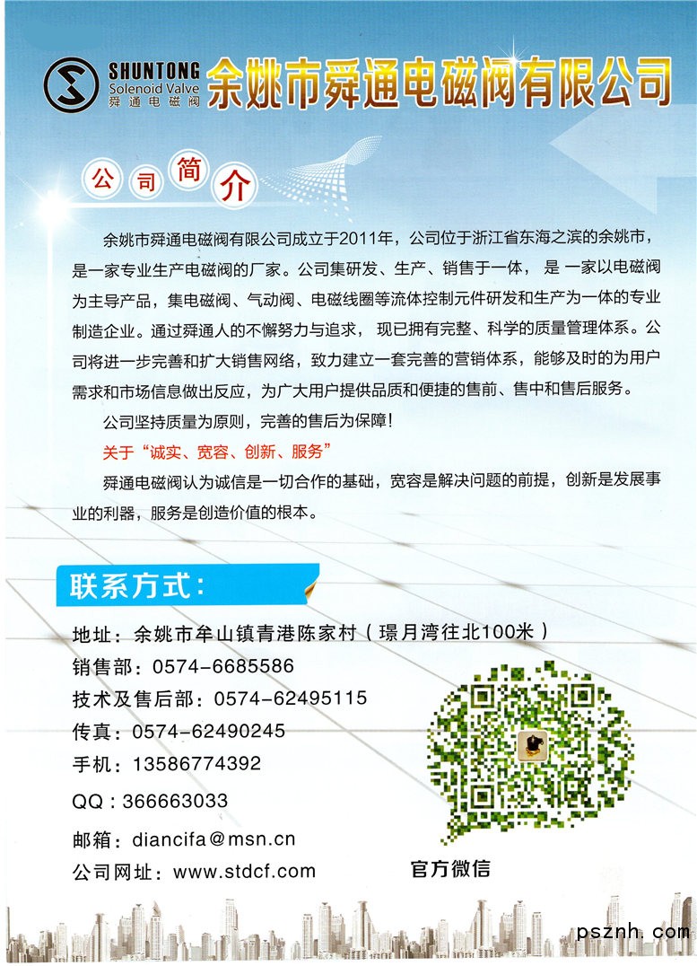 余姚市舜通電磁閥有限公司是專(zhuān)業(yè)的電磁閥制造商。公司集研發(fā)、生產(chǎn)、銷(xiāo)售于一體, 是 一家以電磁閥為主導(dǎo)產(chǎn)品,集電磁閥、氣動(dòng)閥、電磁線(xiàn)圈等流體控制元件研發(fā)和生產(chǎn)為一體的專(zhuān)業(yè)制造企業(yè)。通過(guò)舜通人的不懈努力與追求, 現(xiàn)已擁有完整、科學(xué)的質(zhì)量管理體系,公司將進(jìn)一步完善和擴(kuò)大銷(xiāo)售網(wǎng)絡(luò),致力建立一套完善的營(yíng)銷(xiāo)體系,能夠及時(shí)的為用戶(hù)需求和市場(chǎng)信息做出反應(yīng),為廣大用戶(hù)提供品質(zhì)和便捷的售前、售中和售后服務(wù)。