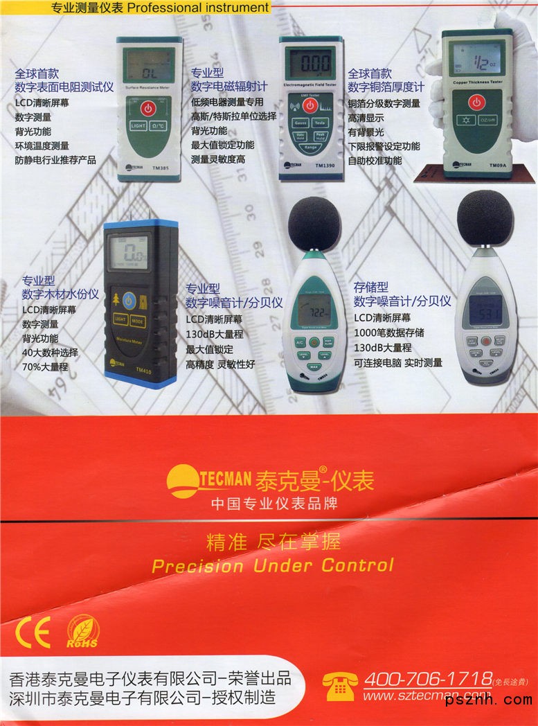 泰克曼電子儀器(香港)控股有限公司深圳市泰克曼電子有限公司公司簡(jiǎn)介: 香港泰克曼電子儀器控股有限公司(TECMAN ELECTRonIC INSTRUMENT HOLDINGS LIMITED)專業(yè)研發(fā)及制造TECMAN(泰克曼)品牌系列各類專業(yè)儀器儀表,公司產(chǎn)品包含:便攜式非接觸紅外測(cè)溫儀、數(shù)字式測(cè)振儀、超聲波測(cè)厚儀、涂層測(cè)厚儀、數(shù)字風(fēng)速風(fēng)量計(jì)、數(shù)字噪音計(jì)、數(shù)字式溫濕度計(jì)、人體測(cè)溫儀等專業(yè)儀表;對(duì)國(guó)內(nèi)外行業(yè)特殊需求客戶提供OEM及ODM相關(guān)服務(wù)。 本公司秉持:品質(zhì)創(chuàng)造價(jià)值;科技 服務(wù)于人的企業(yè)發(fā)展理念,堅(jiān)持不懈的為國(guó)內(nèi)外客戶提供性能穩(wěn)定,品質(zhì)優(yōu)良的產(chǎn)品。 TECMAN品牌在國(guó)內(nèi)外市場(chǎng)的建設(shè)和推廣是本公司堅(jiān)定不移的目標(biāo),為客戶提供品質(zhì)優(yōu)良的產(chǎn)品和快捷無(wú)憂的售后服務(wù)是本公司信守的諾言。 本公司熱忱歡迎國(guó)內(nèi)外有實(shí)力的客戶共同開發(fā),協(xié)作發(fā)展,開創(chuàng)TECMAN美好的未來(lái)。 香港泰克曼電子儀器控股有限公司 TECMAN ELECTRonIC INSTRUMENT HOLDINGS LIMITED